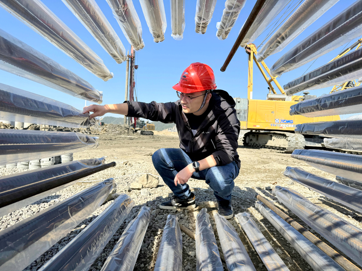 浙江浙能六橫液化天然氣有限公司員工嚴(yán)捷正在認(rèn)真檢查鋼筋籠制作及成品保護(hù)。 周志南 攝