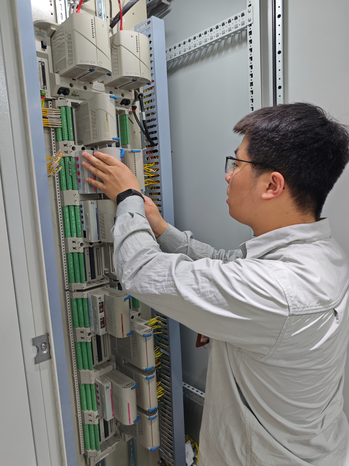 勁儀、短接線、電筆.......負(fù)責(zé)在電子室送信號(hào)的鐘佳源將所需的“裝備”有條不紊地從背包里拿出,胡遠(yuǎn)亮則緊盯著卡件組態(tài),對(duì)后續(xù)測(cè)試步驟進(jìn)行梳理,做到心中有數(shù)。為較好還原樂電三期機(jī)組實(shí)際負(fù)荷接線方式,鐘佳源嚴(yán)格按照三期DEH卡件供電方式對(duì)備品卡件的通道接線送信號(hào),勢(shì)必把精確度拿捏到位,確保萬無一失。