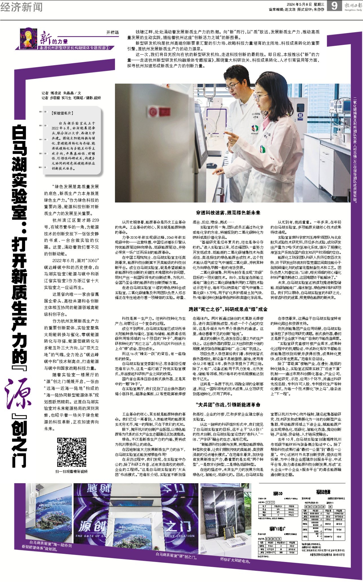 5月8日,《杭州日報》整版報道《白馬湖實驗室:打開新質(zhì)生產(chǎn)力的“源”創(chuàng)之門》。 杭州日報 提供