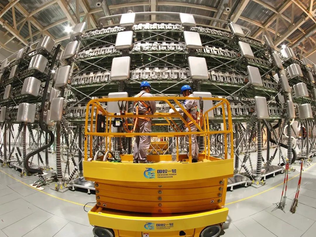 舟山五端柔性直流輸電工程,國(guó)網(wǎng)舟山供電公司電力工人進(jìn)行柔直換流站閥廳子模塊調(diào)試。