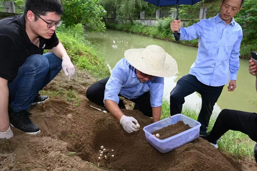 在灘坑水電站水生生物增殖放流站親黿培育池旁的土坡上,增殖放流站站長(zhǎng)葉承義正在珠江水產(chǎn)研究所所長(zhǎng)朱新平的遠(yuǎn)程指導(dǎo)下,對(duì)黿卵進(jìn)行操作。“我們不能亂挖一氣,濕潤(rùn)的沙土中往往埋藏著黿卵,挖的時(shí)候動(dòng)作必須要輕柔。”葉承義用手將產(chǎn)卵周邊的沙土一點(diǎn)點(diǎn)撥開。