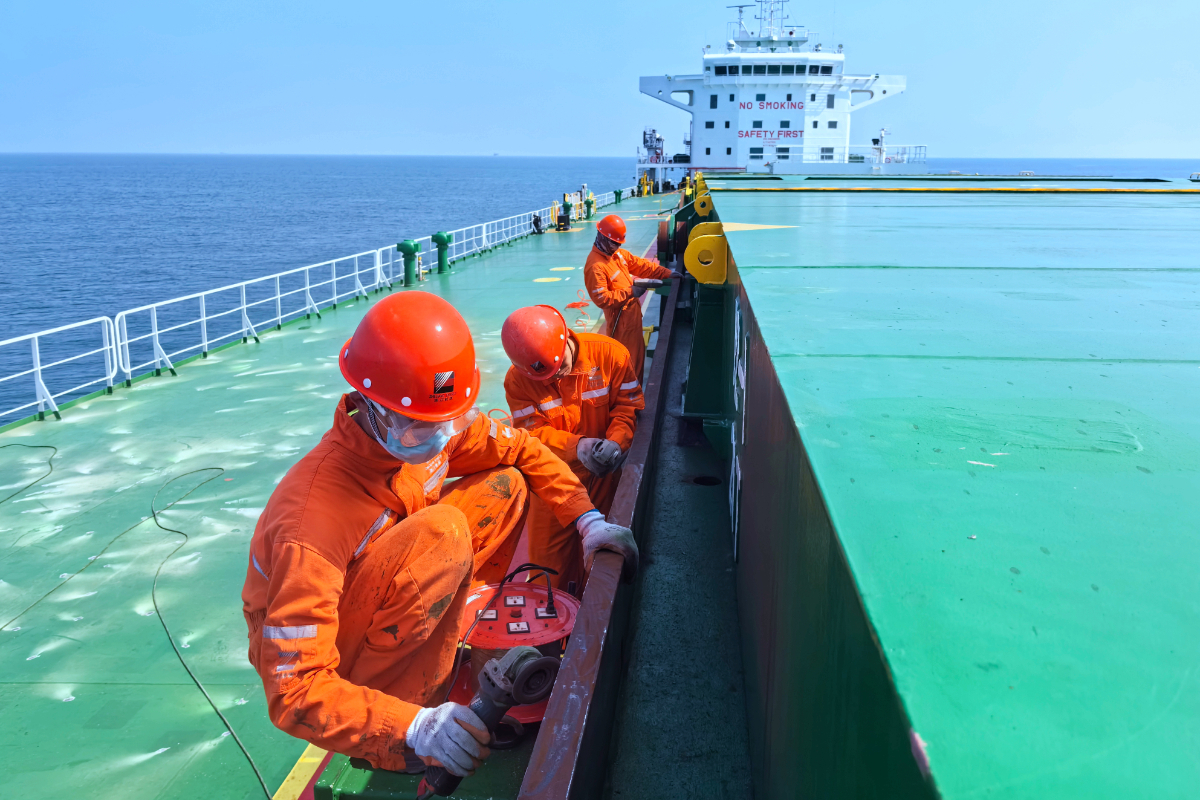 寧波海運(yùn)船員們?cè)谘谉岬拇凹装迳线M(jìn)行除銹作業(yè)。 李亞軍 攝