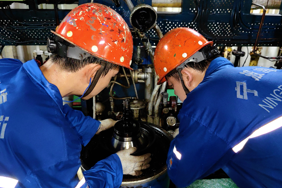 寧波海運(yùn)船員在悶熱的機(jī)艙內(nèi)開(kāi)展設(shè)備保養(yǎng)。 李靖南 攝