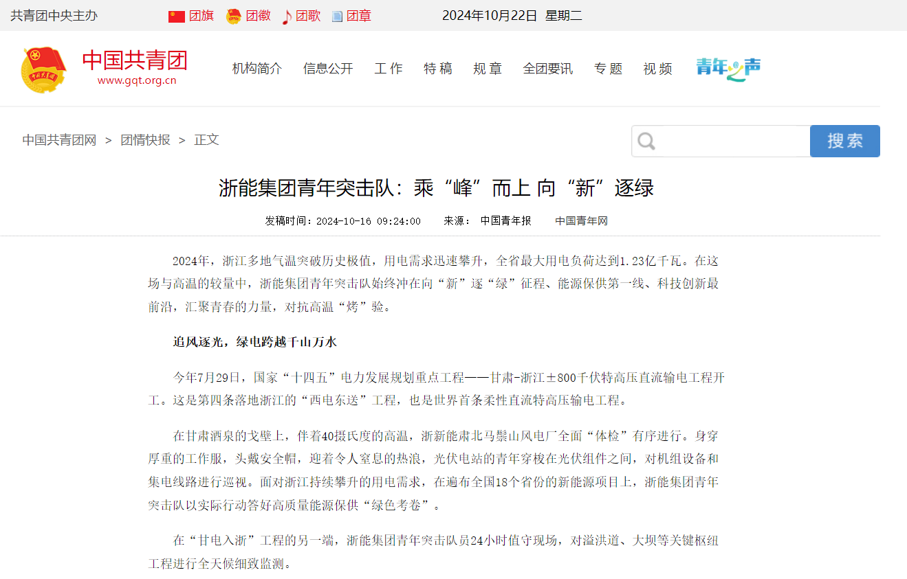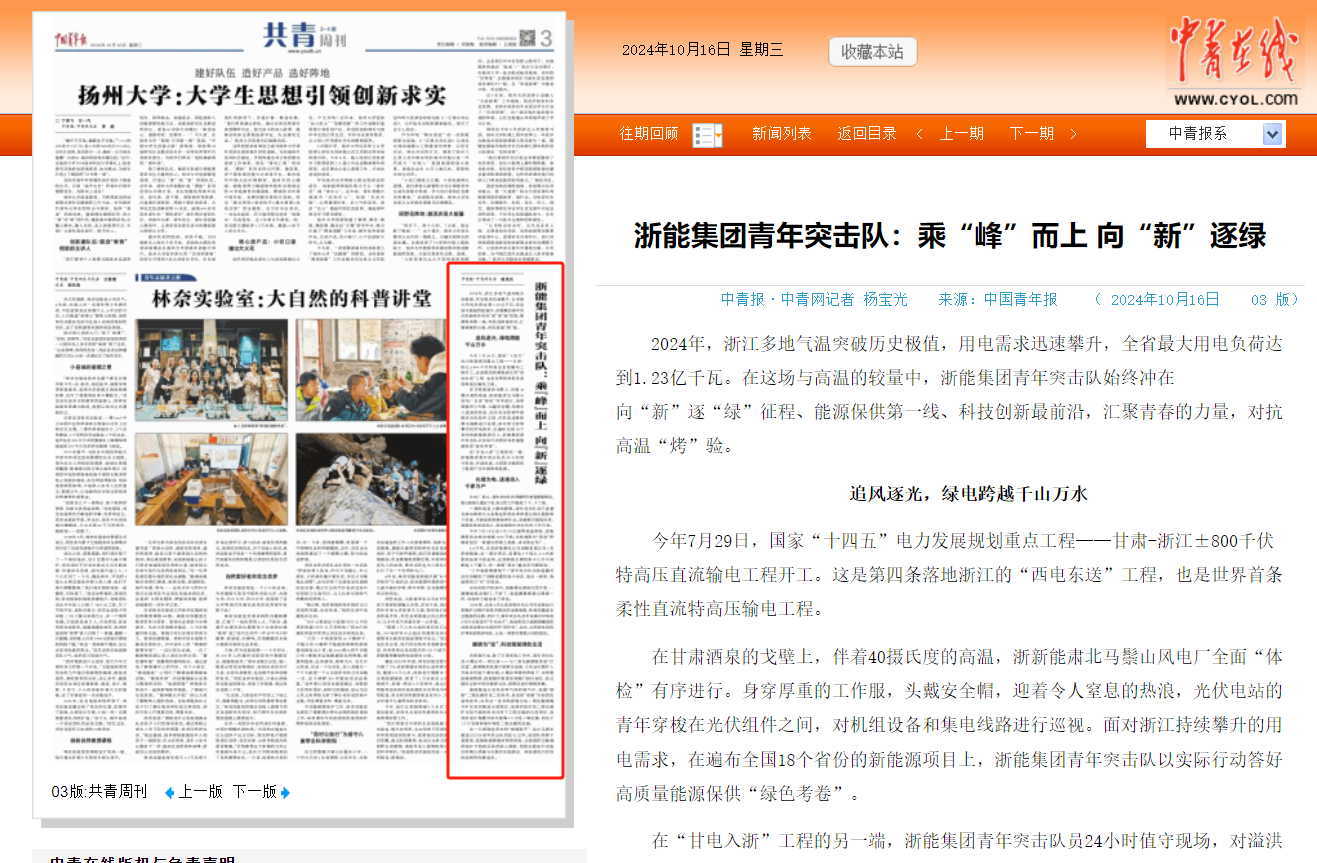 編者按:浙能集團(tuán)青年突擊隊(duì)在2024年浙江多地氣溫突破歷史極值、用電需求迅速攀升的情況下,始終沖在向“新”逐“綠”征程、能源保供第一線、科技創(chuàng)新最前沿,匯聚青春的力量,對抗高溫“烤”驗(yàn)”。10月16日,中國青年報(bào)、共青團(tuán)中央官網(wǎng)等平臺刊發(fā)《浙能集團(tuán)青年突擊隊(duì):乘“峰”而上 向“新”逐綠》,聚焦浙能青春力量。