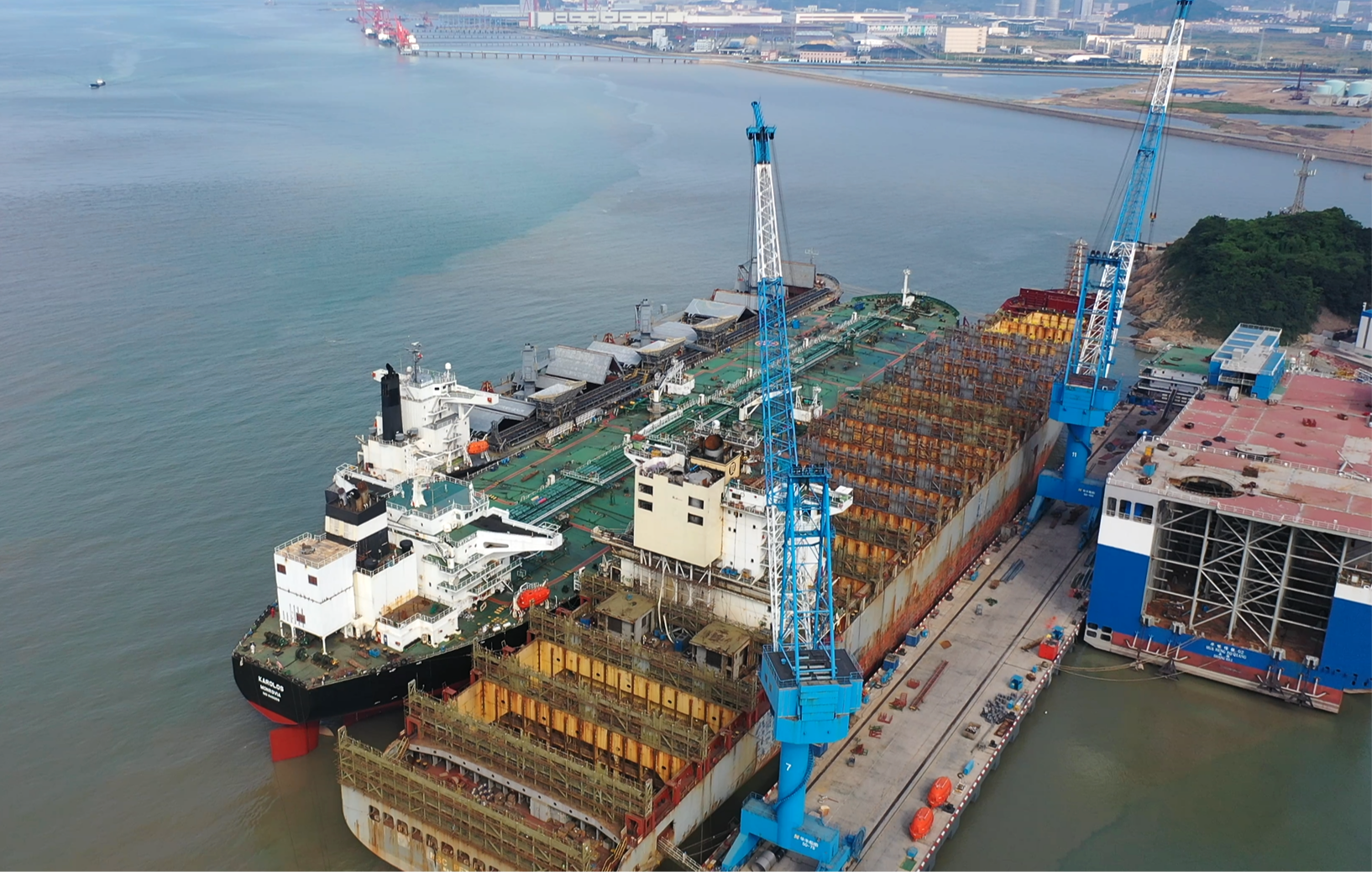 舟山華豐船廠,浙能集團(tuán)所屬邁領(lǐng)公司為瑞士地中海航運(yùn)公司PETRA號(hào)集裝箱貨輪加裝脫硫裝置。 李夢(mèng) 提供