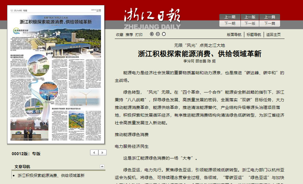 浙江日?qǐng)?bào)12月12日12版《浙江積極探索能源消費(fèi)、供給領(lǐng)域革新》圖。 浙江日?qǐng)?bào) 圖