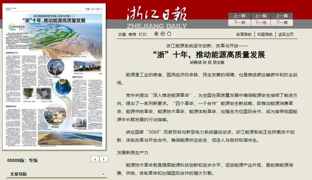 浙江日?qǐng)?bào)12月13日9版《“浙”十年,推動(dòng)能源高質(zhì)量發(fā)展》圖。 浙江日?qǐng)?bào) 圖