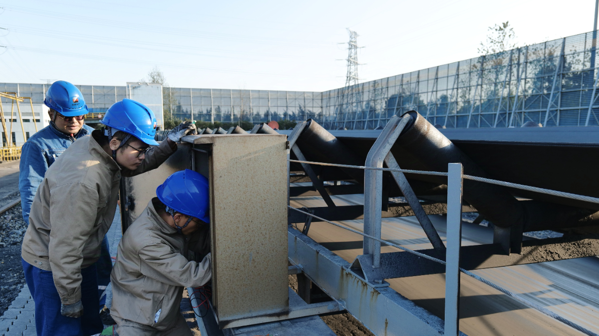 11月27日,浙能港口公司電儀班員工在煤炭堆場(chǎng)C6D皮帶處對(duì)拉繩開(kāi)關(guān)進(jìn)行檢查。 錢(qián)威 攝