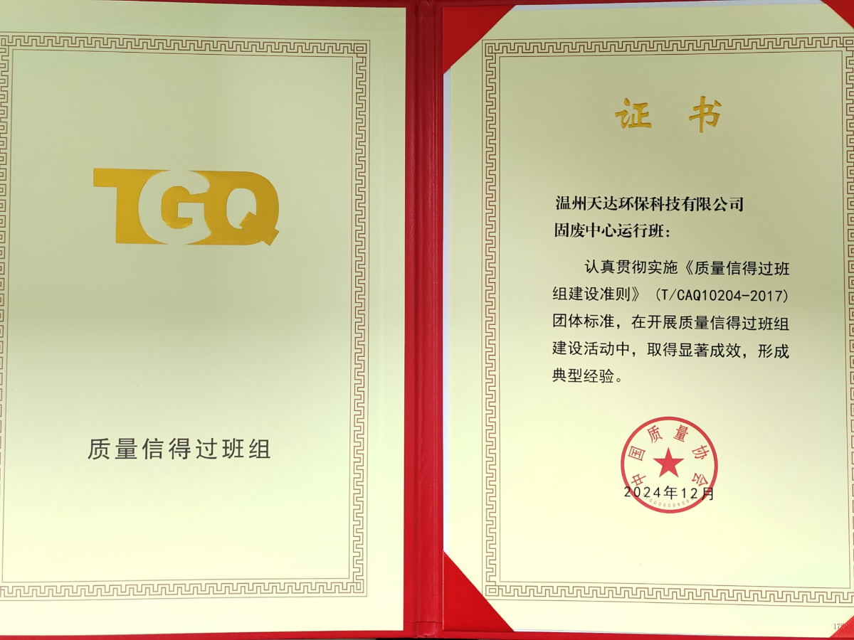 溫州天達環(huán)保科技有限公司固廢中心運行班組“全國質(zhì)量信得過班組”榮譽證書。 傅催然 攝