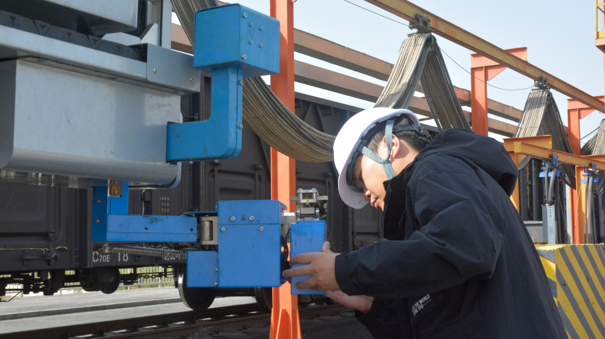 “翻車機全自動智能摘復(fù)鉤機器人”研發(fā)項目團隊成員現(xiàn)場調(diào)試摘復(fù)鉤機器人。 駱洲 提供