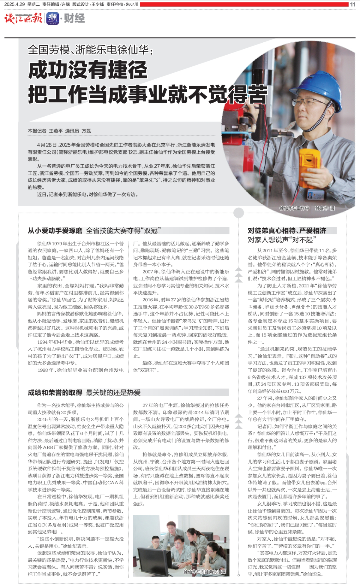 4月28日,潮新聞報(bào)道《全國(guó)勞模、浙能樂(lè)電徐仙華:成功沒(méi)有捷徑,把工作當(dāng)成事業(yè)就不會(huì)覺(jué)得苦》。 潮新聞 提供