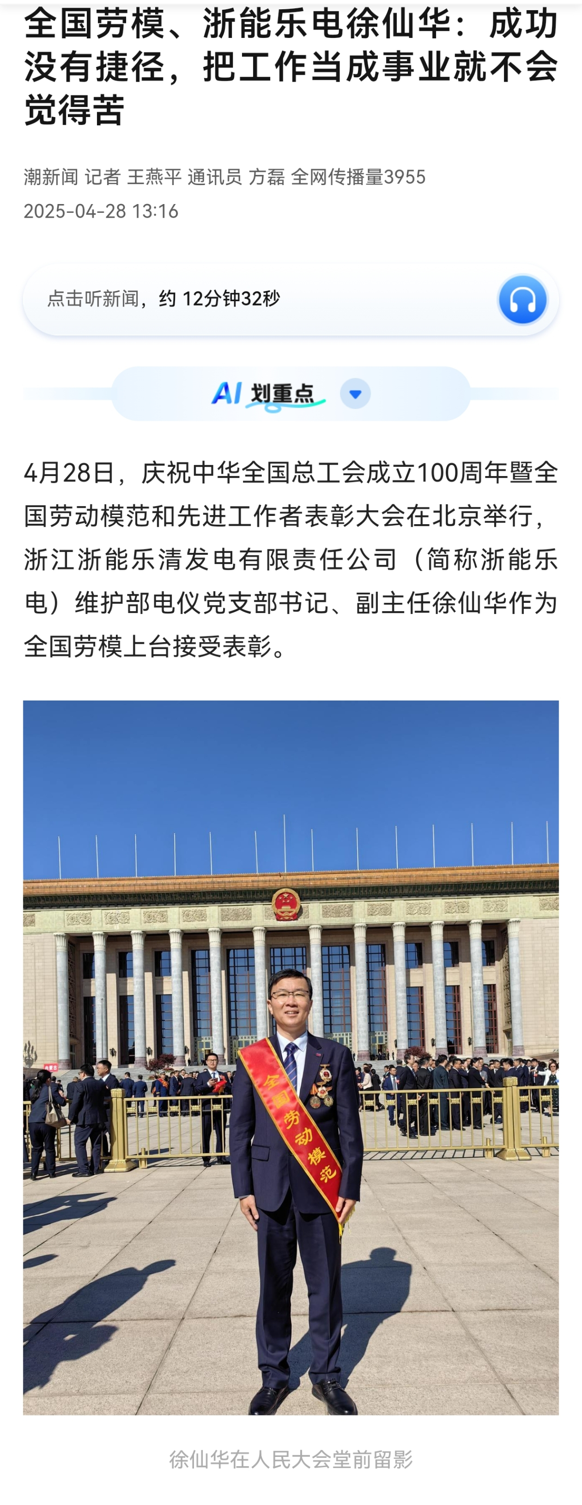 編者按:4月28日,慶祝中華全國(guó)總工會(huì)成立100周年暨全國(guó)勞動(dòng)模范和先進(jìn)工作者表彰大會(huì)在北京舉行,浙能集團(tuán)所屬浙江浙能樂(lè)清發(fā)電有限責(zé)任公司維護(hù)部電儀黨支部書(shū)記、副主任徐仙華作為全國(guó)勞模接受表彰。新華社、浙江衛(wèi)視、錢(qián)江晚報(bào)、潮新聞、中國(guó)電力報(bào)、中國(guó)能源網(wǎng)等多平臺(tái)聚焦徐仙華同志多年扎根一線奮斗事跡。