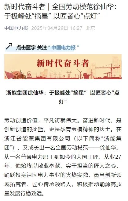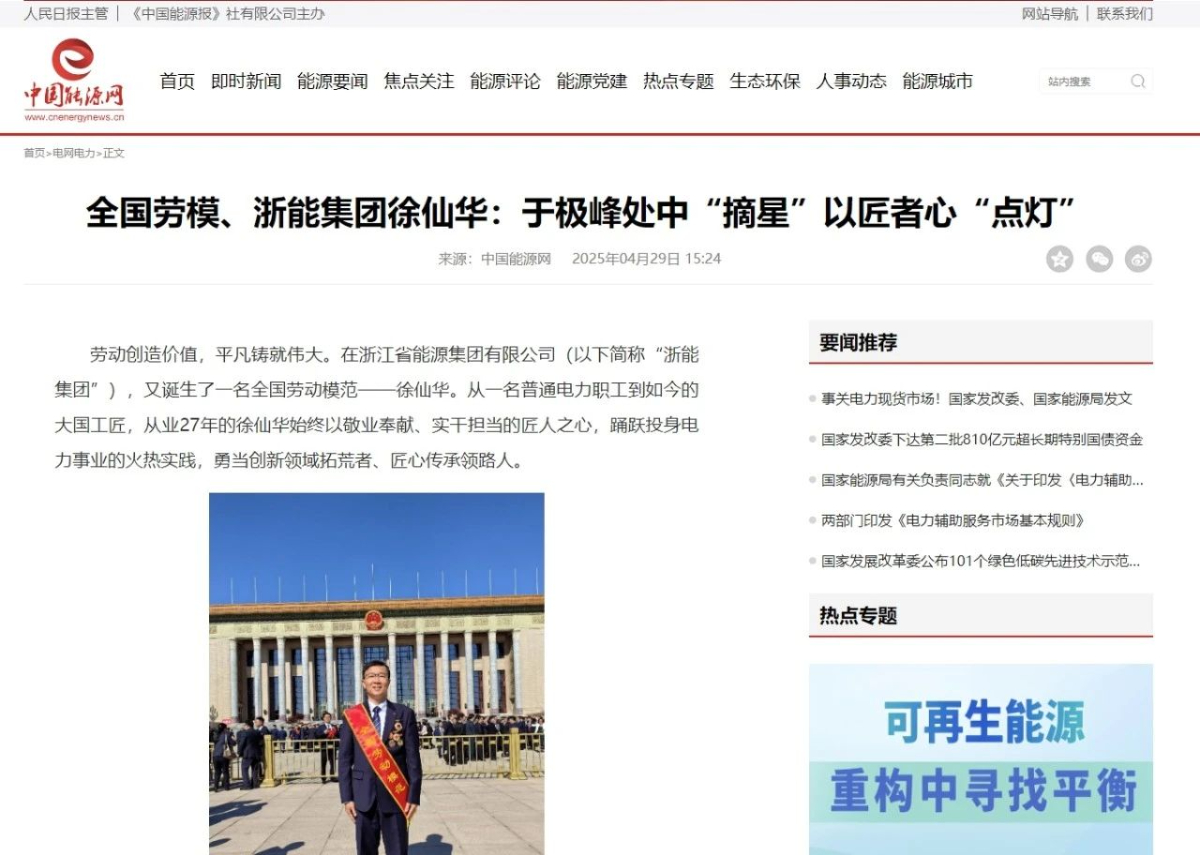 4月29日,人民日?qǐng)?bào)旗下中國(guó)能源網(wǎng)報(bào)道《全國(guó)勞模、浙能集團(tuán)徐仙華:于極峰中“摘星” 以匠者心點(diǎn)燈》 中國(guó)能源網(wǎng) 攝