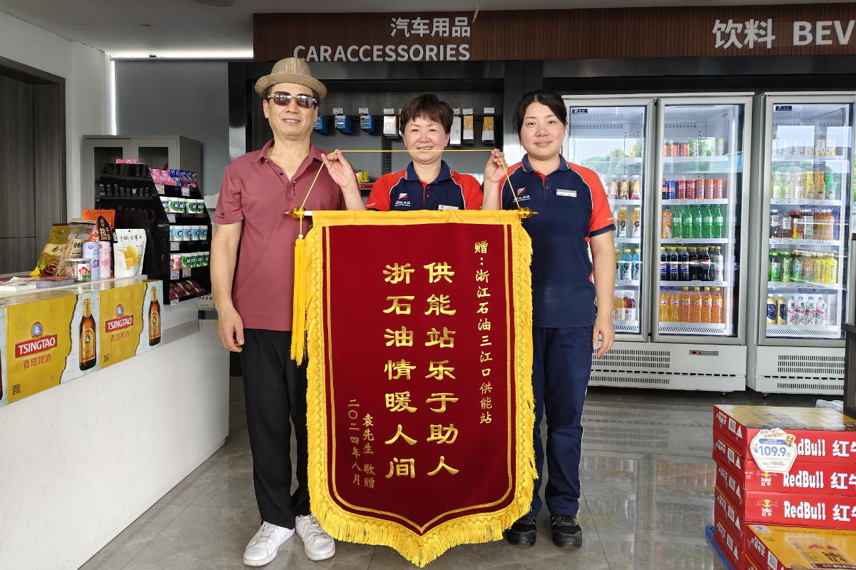 嵊州市民向浙石油紹興嵊州三江口站贈送錦旗,感謝危急時刻的生命救助。 王浙攀 攝