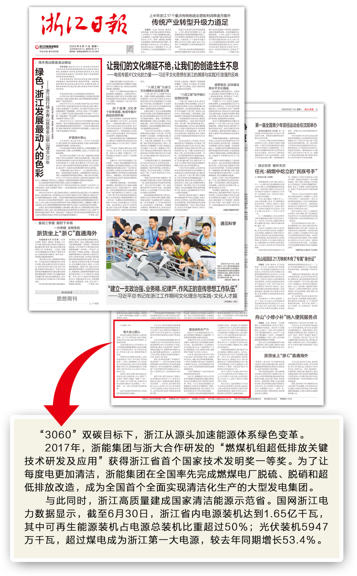 此前8月11日,《浙江日報》頭版頭條刊發(fā)綜述稿《綠色,浙江發(fā)展最動人的色彩——浙江踐行綠水青山就是金山銀山理念20年》,浙能集團入列其中。 浙江日報 提供