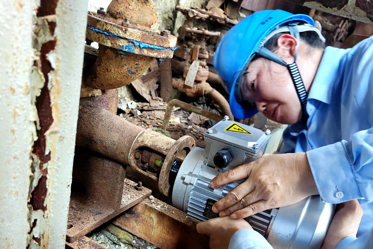 話音未落,金潔接到班長(zhǎng)電話,要趕到9號(hào)爐MGGH登高更換超聲波吹灰器電機(jī)。接近二十斤重的電機(jī)看似不重,但需要在狹小空間內(nèi)托舉接近半小時(shí),十分考驗(yàn)力量與耐力。而同班組的王海嬌則趕往廢水預(yù)處理更換1號(hào)提升泵電機(jī),她頂著烈日耐心地整理著電纜與接口,與同事們一起奮戰(zhàn)一上午完成了電機(jī)更換工作,等工作完畢已是汗?jié)袢怼?/p>