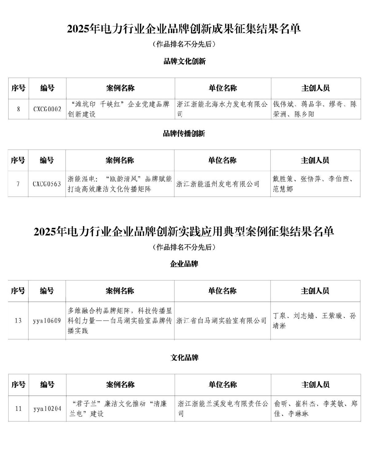 為深入貫徹《質(zhì)量強(qiáng)國(guó)建設(shè)綱要》,加快構(gòu)建新型電力系統(tǒng)背景下的品牌創(chuàng)新生態(tài)體系,切實(shí)推進(jìn)電力行業(yè)品牌建設(shè),發(fā)揮品牌引領(lǐng)示范作用,選樹一批電力品牌創(chuàng)新典型,中電聯(lián)電力品牌集群辦公室在行業(yè)內(nèi)開展了2025年電力行業(yè)企業(yè)品牌創(chuàng)新成果及實(shí)踐應(yīng)用典型案例征集活動(dòng),得到了廣大成員單位及有關(guān)單位的大力支持和積極參與。經(jīng)專家組嚴(yán)格遴選,本次活動(dòng)精選出了90項(xiàng)創(chuàng)新成果及79個(gè)典型案例。浙能北海水電《“灘坑印 千峽紅”企業(yè)黨建品牌創(chuàng)新建設(shè)》、浙能溫電《“甌韻清風(fēng)”品牌賦能打造高效廉潔文化傳播矩陣》獲評(píng)2025年電力行業(yè)企業(yè)品牌創(chuàng)新成果,白馬湖實(shí)驗(yàn)室《多維融合構(gòu)品牌矩陣,科技傳播顯科創(chuàng)力量一一白馬湖實(shí)驗(yàn)室品牌傳播實(shí)踐》、浙能蘭溪發(fā)電《“君子蘭”廉潔文化推動(dòng)“清廉蘭電”建設(shè)》獲評(píng)品牌創(chuàng)新實(shí)踐應(yīng)用典型案例。