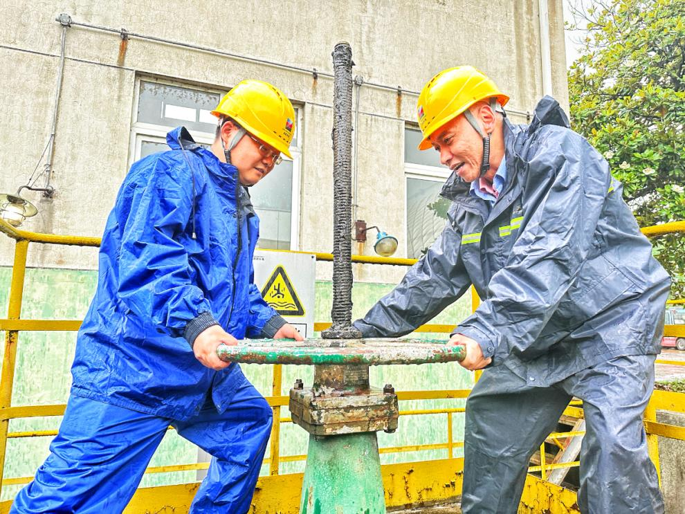 2025年臺風(fēng)來襲時,浙能長電黨員沖鋒在前,冒雨操作雨水泵房前池隔離閥。 朱海 攝