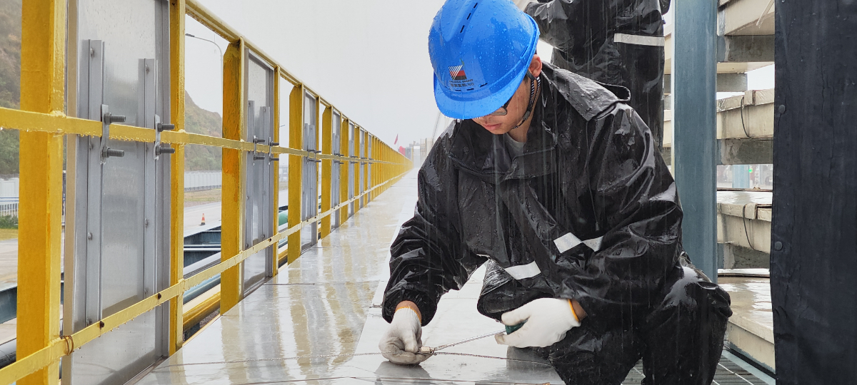 臺風(fēng)來臨前,溫州LNG公司青年突擊隊隊員冒雨沖鋒,扎實開展電纜橋架蓋板緊固工作。 謝晨瀅 攝