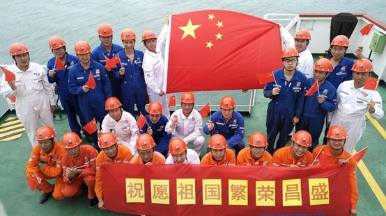 在錨地等候裝卸的浙能“明州76”輪全體船員與國旗同框,共慶新中國成立70周年。董建國 攝