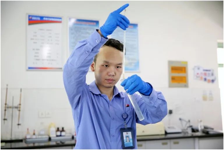 6月5日,浙能長電公司化學(xué)專業(yè)人員正在觀察中水系統(tǒng)處理后的水樣。