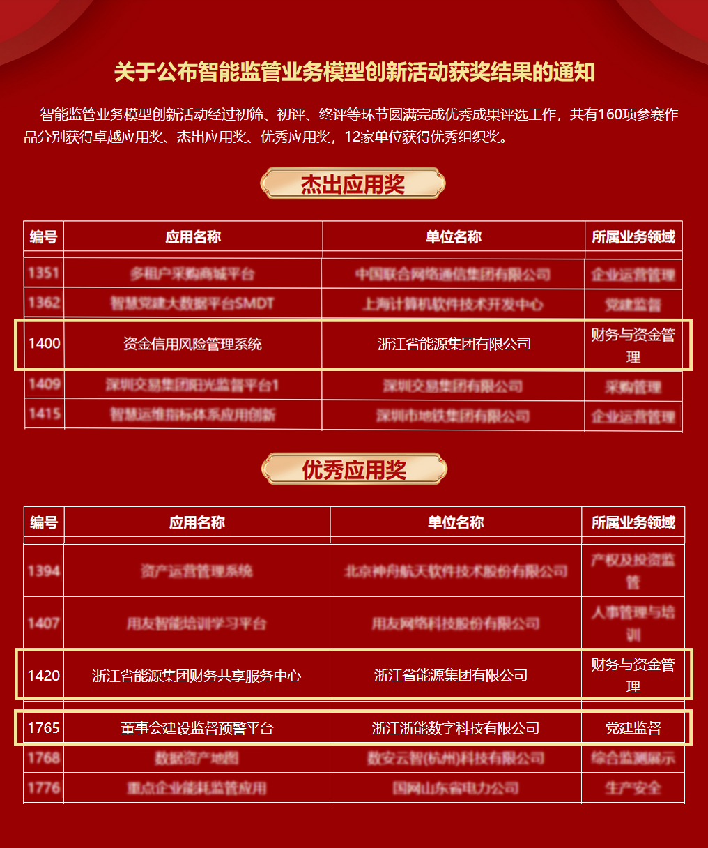 近日,國務院國資委2023年智能監(jiān)管業(yè)務模型創(chuàng)新活動獲獎名單揭曉,浙能集團《資金信用風險管理系統(tǒng)》榮獲“杰出應用獎”,《財務共享服務中心》《董事會建設監(jiān)督預警平臺》榮獲“優(yōu)秀應用獎”。